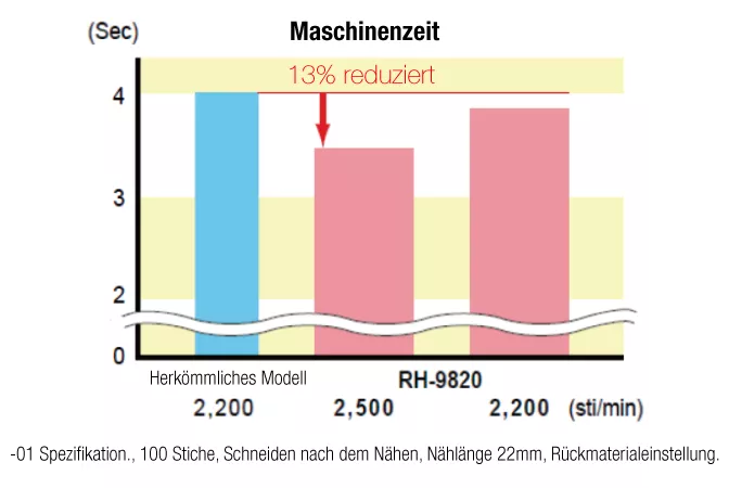 Die maximale Nähgeschwindigkeit von 2.500 Stiche/min wurde durch die Verwendung einer optimalen Maschinenstruktur, für den Höchstgeschwindigkeitsantrieb, erreicht. Die Geshwindigkeit wird gegenüber dem bisherigen Niveau von 2.200 Stiche/min deutlich erhöht. Durch die Steigerung der Festigkeit der Teile des Nadelstangenbereichs (Patent angemeldet) und die servogesteuerte Steuerung des Zuführmeachanismus und des Nadelstangen-Drehmechanismus wurde die Betriebszeit verkürzt, was zu einer Reduzierung des Maschinenzeit um 13% gegenüber dem konventionellen Modell führt.