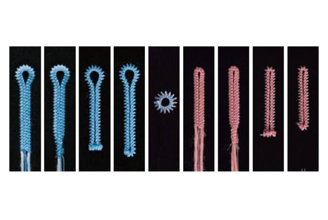 | Funktionen | Nur der Oberfaden wird vom Fadenschneider geschnitten. Knopflöcher bis zu einer Länge von 50mm können genäht werden. | Alle Fäden werden von den Fadenschneidern lang geschnitten. Die langen Fadenenden können im nachfolgenden Prozess sicher gehalten werden. Es eignet sich für Fälle, in denen ein präzises kurzes Ende oder ein manuelles Trimmen erforderlich ist. | Alle Fäden werden von den Fadenschneidern kurz geschnitten. Das erspart den Aufwand für das manuelle Schneiden und reduziert den Verbrauch des Fadens. | |