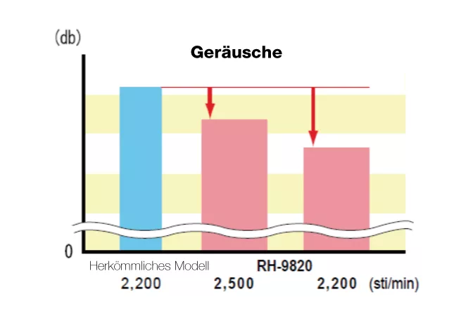 Mit einer gründelichen Überprüfung der geräuschverursachenden Mechanismen wurde ein leises Nähen auch bei höherer Nähgeschwindigkeiten als beim konventionellen Model realisiert. Die Maschine ist mit einem ohrenfreundlichen Sound-Design ausgestattet, das Schlaggeräusche eliminiert. Die Vibration der Zuführbasis, die auf einen Bediener übertragen wird, wird ebenfalls reduziert. Die Arbeitsumgebung mit weniger Ermüdung des Bedieners kann materialisiert werden.