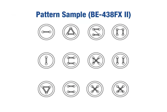 Around 89 patterns have been preset into the sewing machine. Any sewing pattern can be selected as long as the needle will drop into the holes of the buttons. When sewing patterns that do not have crossover stitches, the thread is trimmed after sewing of one side is completed, and then the other side is sewn.