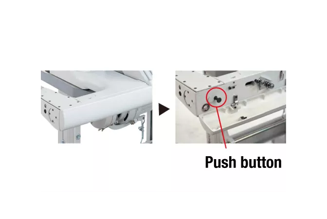 A movable needle guard has been adopted in order to prevent skipped stitches from occurring. The movable needle guard timing and feed mechanism timing are fully coordinated, so that no adjustment is necessary even if the stitch length is changed. (It may be required to readjust the position of the movable needle guard according to materials and threads.)