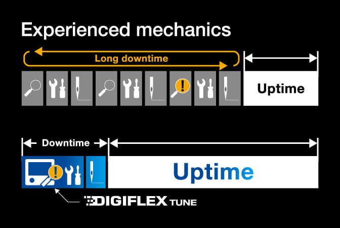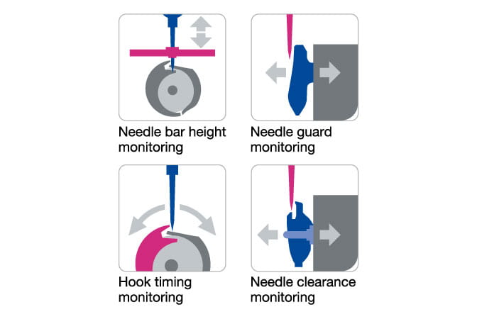 The adjustment time of the sewing machine due to poor sewing is greatly reduced by sensor monitoring technology. Appropriate adjustments depending on the cause of the sewing defect can be made just from checking numerical values on the panel.