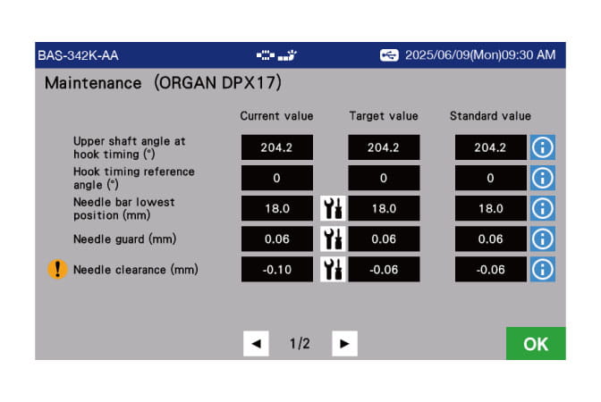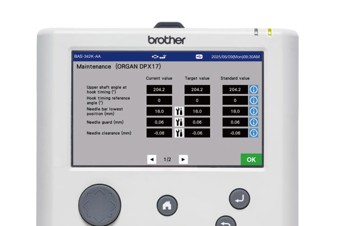 Adjustments in increments of 0.01 millimeters are possible, eliminating variations in adjustments due to people and environments. The sewing machine adjustment, which was done visually or manually, will change to adjusting while checking the target value set on the panel and current value.
