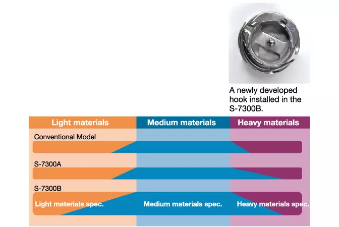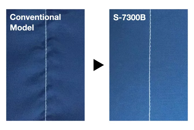 The S-7300B also features the short thread remaining function that was well received on the S-7300A. Also features an improved bird’s nest reduction function that makes it easier to use. These thread technologies reduce the amount of thread treatment work after sewing, improving productivity and reducing the burden on workers.