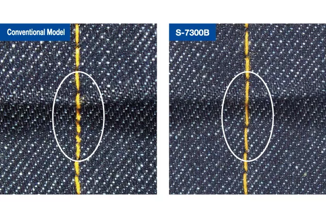 Automatic material thickness sensor detects the thickness while sewing, helping to reduce clogging at cross-over seam and needle breakage, S-7300B enables to correct stitch length automatically, when sensor has been detected cross-over seam, offering stable stitch length and high quality sewing for even unskilled-operator. (Patent applied)