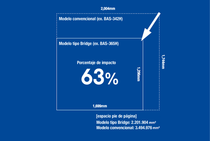 El diseño del espacio de trabajo es extremadamente estrecho para la gran zona de costura de la que dispone, comparada con las máquinas tipo BAS *1, lo que permite hacer espacio para colocar otra maquina adicional.