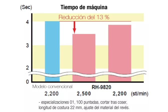 Se ha alcanzado la máxima velocidad de costura de 2500 puntadas/minuto al adoptar una estructura óptima de la máquina para el accionamiento a alta velocidad. La velocidad ha mejorado considerablemente en comparación con el modelo antiguo de 2200 puntadas/minuto. Al mejorar la rigidez de las piezas de la zona de la barra de aguja (pendiente de patente) y tener servo controlado el mecanismo giratorio de alimentación y de la barra de aguja, el tiempo de funcionamiento se redujo en un 13 % en comparación con el modelo convencional.