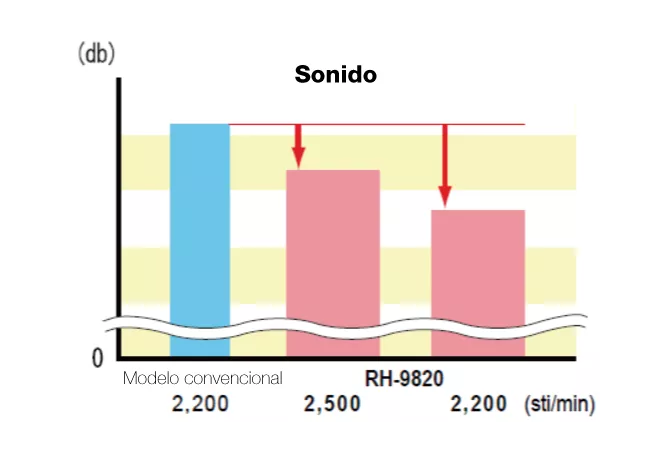 Se ha revisado a fondo el mecanismo causante de ruidos, con lo que se ha conseguido una costura más silenciosa, incluso a altas velocidades, comparada con el modelo convencional. La máquina está fabricada con un sonido agradable al oído, eliminando el impacto del ruido. También se ha reducido la vibración de la base de alimentación que se transmite al operario. Esto ha dado lugar a un entorno de trabajo menos fatigoso para el trabajador.