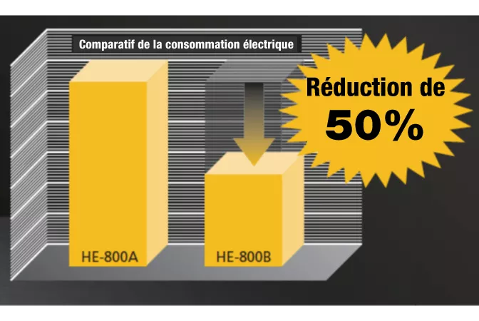 Les systèmes à entraînement direct permettent de réaliser de grandes économies d'énergie, ce qui permet de réduire au minimum les pertes de puissance du moteur, grâce à un moteur original développé par Brother. La consommation électrique de la machine est environ 50% inférieure à celle du modèle précédent HE-800A. Il s’agit d’une machine haut de gamme à économie d’énergie et respectueuse de l’environnement.
