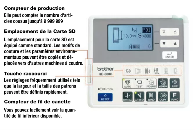 Le HE-800B est équipé d’un affichage à cristaux liquides (LCD) et indique les éléments d’affichage avec des icônes et des lettres. La configuration et la vérification des patrons de couture ainsi que le changement des modes de couture sont faciles à comprendre et à effectuer. Il prend en charge le multilinguisme en tant que langue d'affichage.