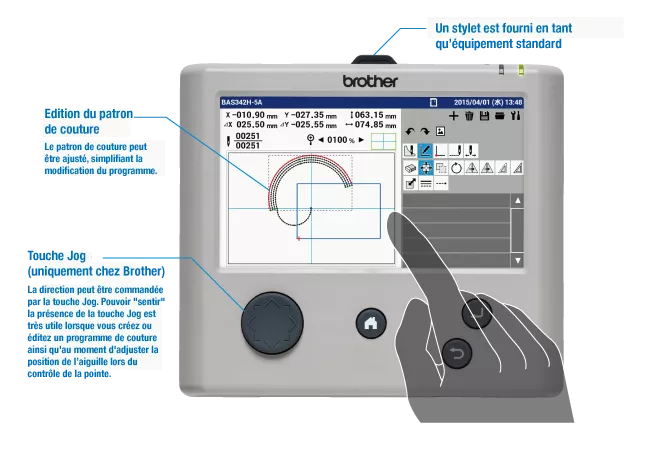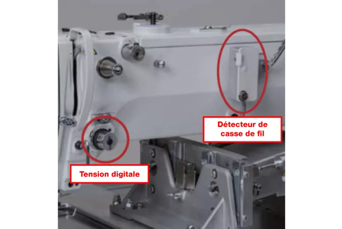 La tension du fil supérieur peut être numérisée avec Digital Tension, offrant une couture stable. Plus besoin de se xfier au sensations individuelles. Lorsque la rupture du fil est détectée, l'opération de couture est arrêtée automatiquement et un avertissement est donné à l'opérateur, ce qui a pour effet de réduire le nombre de détectives.
