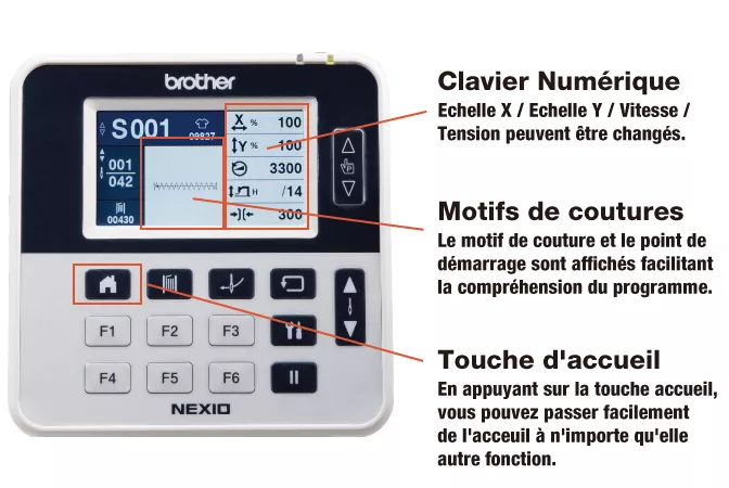 Équipé de l’écran couleur LCD avec un écran tactile qui indique les éléments à afficher avec des icônes d’illustration, offrant une utilisation intuitive. Il est très facile de définir le programme de cycle, ainsi que les patrons de couture, la vitesse de couture et le grossissement. La tension du fil supérieur peut être facilement enregistrée en tant que programmes utilisateur.