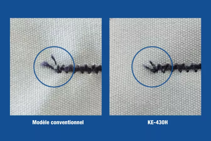 Le coupe-fil entraîné par un moteur pas à pas coupe le fil plus court, stable et silencieusement que le coupe-fil mécanique conventionnel. Il réduit le travail de coupe à la main après la couture. De plus, la pince à fil, équipée de série *, réduit au minimum le fil jeté au début de la couture et au nid d'oiseau .