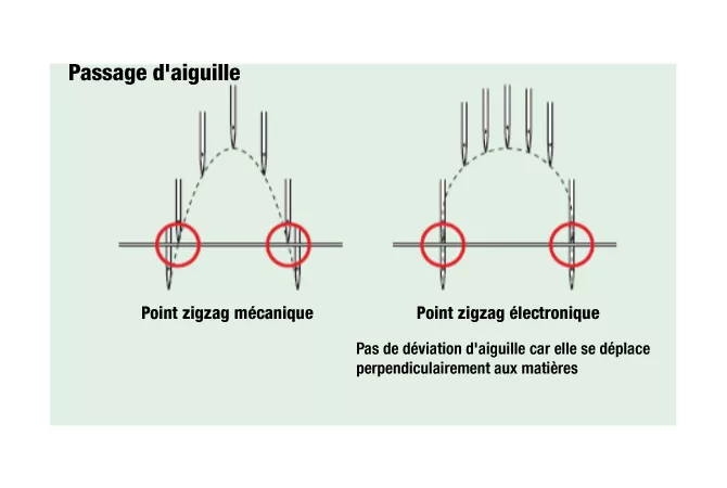 Avec les points de zigzag électroniques, l'aiguille se déplace perpendiculairement au matériau, de sorte que la déviation de l'aiguille ne se produise pas, même à la couture à grande vitesse. En outre, le moteur à impulsions avec asservissement, adopté pour le mécanisme en zigzag, empêche le glissement de position.