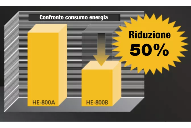 L'elevato risparmio energetico è stato realizzato con il sistema direct drive, che minimizza la perdita di trasmissione del motore originale sviluppato da Brother. Il consumo energetico della macchina è di circa il 50% inferiore rispetto al precedente modello HE-800A. Questa è una macchina al top per risparmio di energia nel settore e rispetta l'ambiente