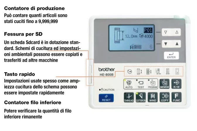 Dotata di un display a cristalli liquidi (LCD) e visulaizza icone e lettere. L'impostazione ed il controllo dei programmi di cuitura ed il cambio delle modalità di cucitura sono semplici da capire ed eseguire. Disponibili diverse lingue