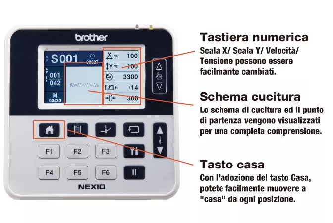 Dotata di pannello touch con schermo LCD a colori che visualizza icone offrendo un uso intuitivo delle funzioni. Molto semplice impostare programmi a ciclo, schemi di cucitura, velocità di cucitura ed ingrandimenti. La tensione del filo superiore può essere facilamente memorizzata come programmi utente