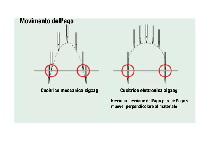 Con la macchina zigzag elettronica, l'ago si muove perpendicolarmente al materiale evitando la flessione dell'ago anche ad alta velocità. Inoltre il motore ad impulsi con servo control, adottato per il meccanismo zigzag, previene lo slittamento della posizione.
