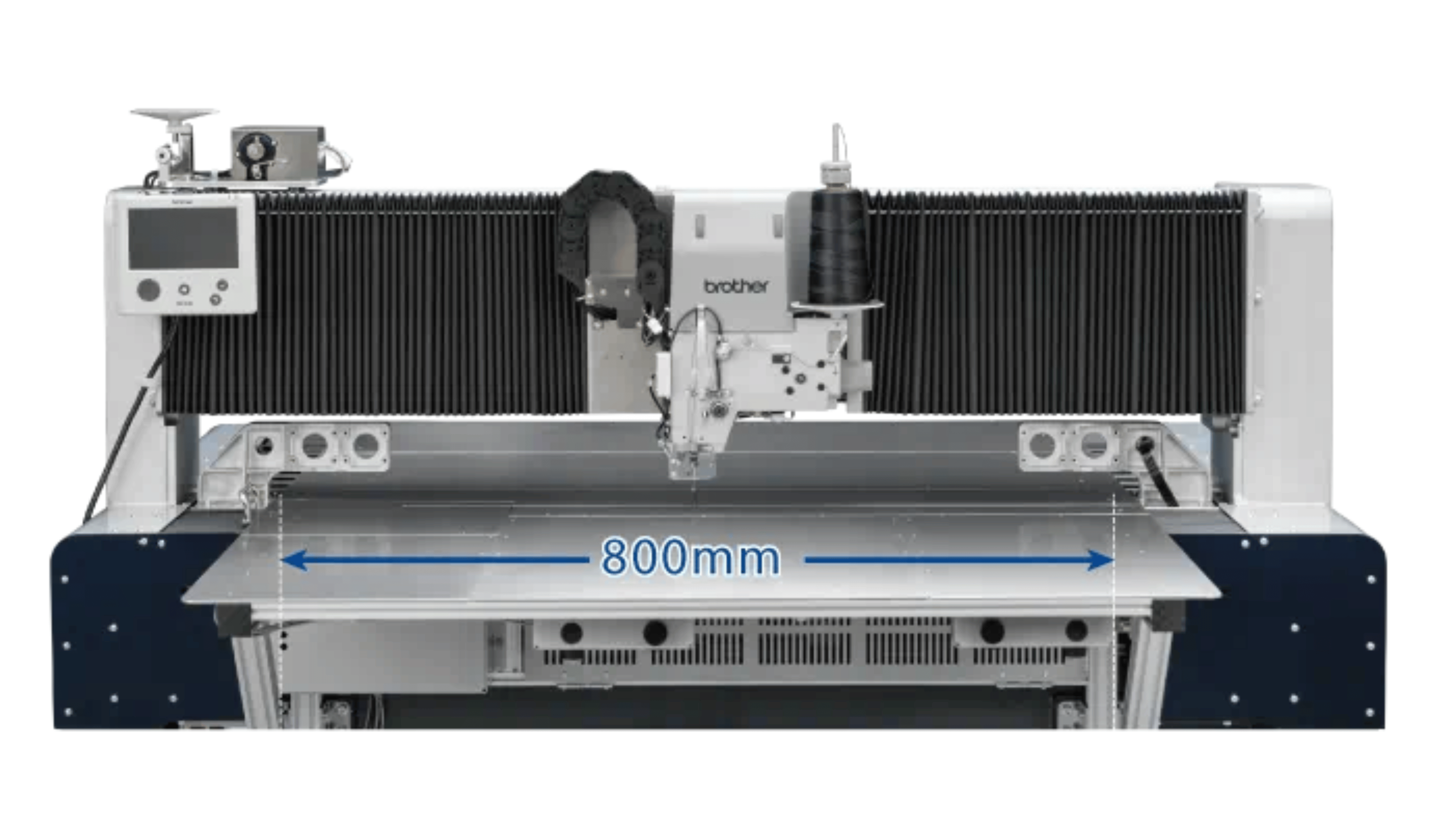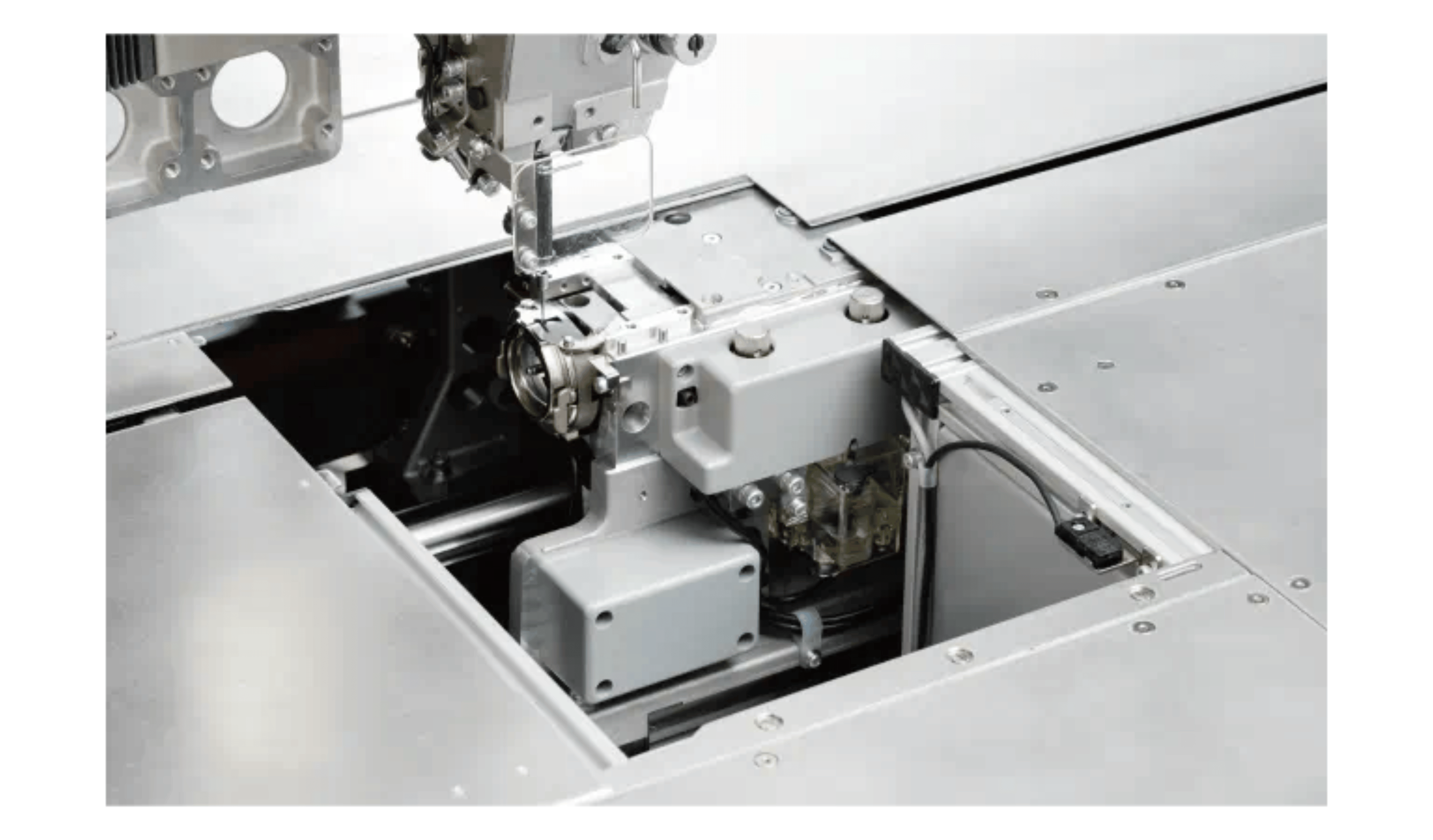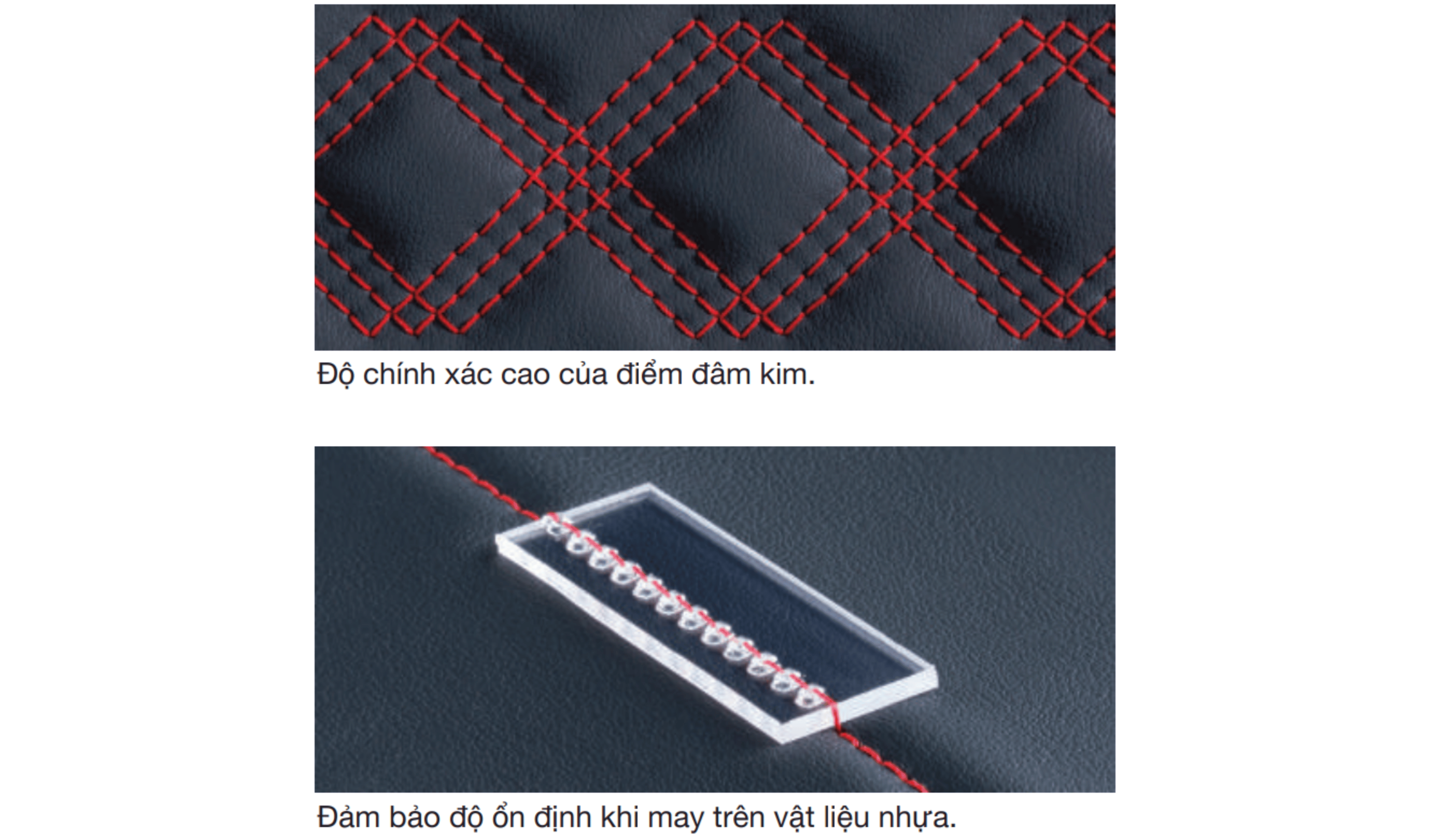 Bằng cách tối đa hóa vùng may nhờ dạng đầu máy di chuyển độc lập, giờ đây có thể may các tấm vật liệu lớn như túi khí – sản phẩm trước đây khó gia công. Ngoài ra, cơ cấu dẫn động độc lập theo trục XY giúp đạt độ chính xác may cao, cho phép thực hiện các đường may trang trí chất lượng cao trên ghế xe hơi, sản phẩm da, v.v